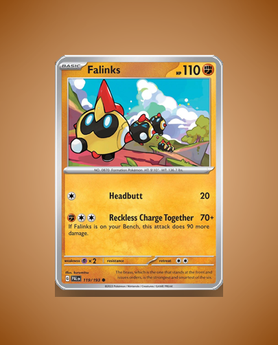 In the vibrant world of Paldea Evolved, Falinks (#119) stands tall as a common find among collectors. This resilient Pokémon boasts a robust HP of 110, ready to withstand the fiercest battles. Its unique attack, Reckless Charge Together, is a testament to its aggressive nature and teamwork, making it an exciting addition to any deck.
