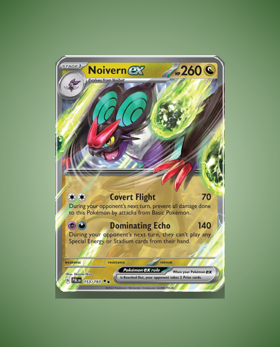In the expansive world of Paldea Evolved, Noivern ex soars with an enigmatic grace as a Double Rare Pokémon (number 153). Boasting an impressive HP of 260, this formidable creature’s attack, Dominating Echo, is a force to be reckoned with. Despite the absence of known abilities, collectors eagerly anticipate uncovering the secrets that Noivern ex holds.