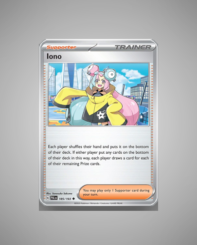 In the vibrant world of Paldea Evolved, the uncommon Pokémon Iono (#185) makes its debut. This enigmatic creature boasts a unique design that sets it apart from other members of its evolutionary line. While details about its HP, ability, and attack remain undisclosed, collectors eagerly anticipate unveiling Iono’s hidden strengths.