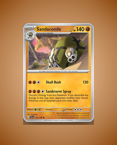 In the expansive Scarlet Violet set, the Uncommon Pokémon Sandaconda (#120) emerges with a commanding presence, boasting a robust HP stat of 140. Its signature attack, Skull Bash, is a powerful display of its might. Despite the absence of an explicitly stated ability, the enigma surrounding this elusive creature only adds to its allure for collectors and trainers alike.