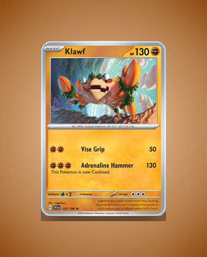 In the vibrant world of Scarlet Violet, collectors will be thrilled to encounter Klawf, a Rare Pokémon making its debut as number 122. This formidable creature boasts an impressive Health Point total of 130, preparing it for intense battles ahead. Its signature attack, Adrenaline Hammer, is sure to leave opponents stunned. Despite the absence of known abilities, Klawf’s presence in any collection promises excitement and potential strategy.