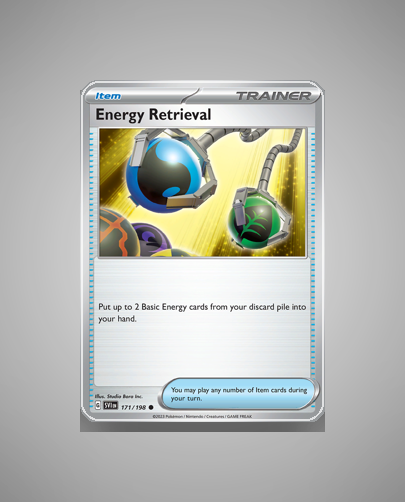 In the vibrant world of Scarlet Violet, prepare to encounter Energy Retrieval, a versatile Common card (#171) that’s essential for any trainer’s deck. This strategic tool has no HP, but its unique ability remains undisclosed, adding an element of mystery to its gameplay. Whether you’re a seasoned collector or a novice just starting your journey, Energy Retrieval is a must-have addition to your Pokémon TCG collection.
