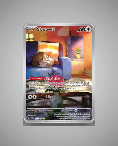 In the vibrant world of Scarlet Violet, a new Illustration Rare Pokémon takes center stage: Skwovet (#222). This plump, berry-loving Pokémon boasts an impressive 60 HP and packs a powerful Bite attack. With its unique ability, Nest Stash, Skwovet is ready to store away the competition in your Pokémon TCG collection.