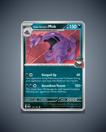 Team Rocket’s Muk from the Destined Rivals set is an Uncommon card numbered 124. With 150 HP, it’s a sturdy option that leans into status effects. Its attack, Hazardous Venom, adds a strategic edge to gameplay. This card stands out with its distinctive design and reliable performance.