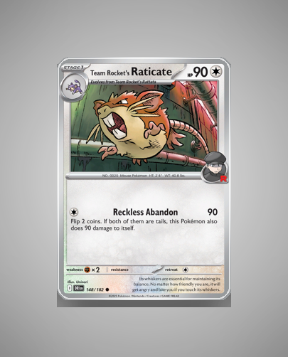 Team Rocket’s Raticate from the Destined Rivals set is a common card numbered 148. It features 90 HP and a single attack called Reckless Abandon. This straightforward design makes it a solid choice for collectors focusing on Team Rocket-themed cards.