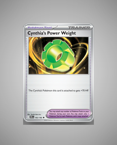 - Destined Rivals (sv10): Features Cynthia’s Power Weight as an uncommon Pokémon Tool card that boosts HP for Cynthia’s Pokémon, adding tactical depth to gameplay within the Scarlet & Violet series.