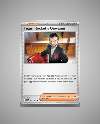 • Destined Rivals: Introduces Team Rocket’s Giovanni as a Supporter card with a tactical switching effect, adding strategic depth to Team Rocket-themed decks. The set features distinctive artwork and regulation mark I, marking its place in the Scarlet & Violet series.