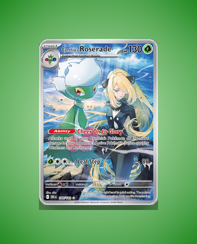 • Destined Rivals (sv10): Cynthia’s Roserade debuts as a powerful Grass-type Stage 1 Pokémon with a unique ability that enhances Cynthia’s Pokémon attacks. Its Illustration Rare status makes it a prized collectible within this set.