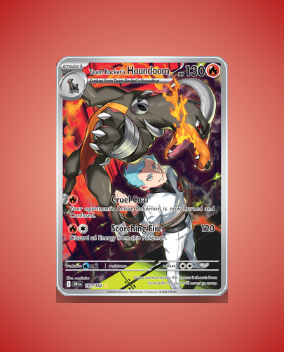 - Destined Rivals (sv10): The sole set featuring Team Rocket’s Houndoom, highlighting its fiery attacks and unique status as an Illustration Rare card. The set focuses on Scarlet & Violet series Pokémon with a mix of powerful Stage 1 evolutions.