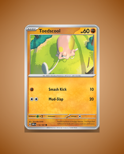 • Obsidian Flames (sv3): Introduces Toedscool as a basic Fighting-type Pokémon with straightforward attacks and a modest HP pool. This set highlights the Pokémon’s natural habitat and unique flavor text, enriching the Scarlet & Violet series with diverse character designs.