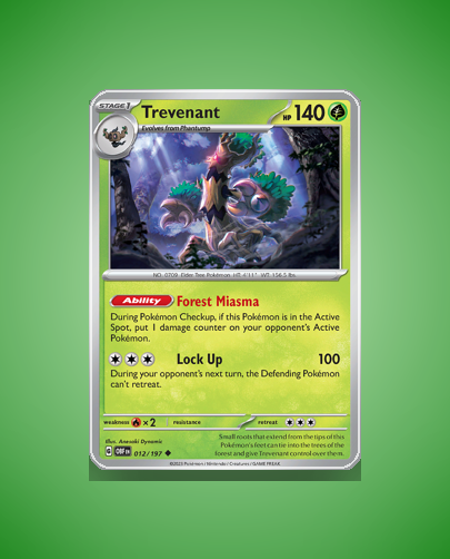 - Obsidian Flames: Introduces Trevenant as a Stage 1 Grass-type with a unique ability to inflict damage counters passively and a powerful Lock Up attack, emphasizing control and disruption in gameplay.