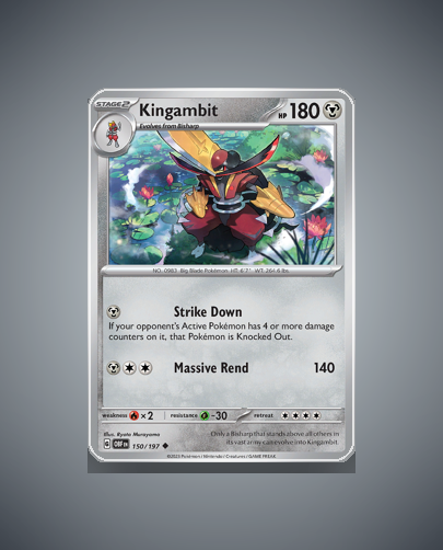 Kingambit is an uncommon Pokémon card from the Obsidian Flames set, numbered 150. With a sturdy 180 HP and the attack Massive Rend, it’s a resilient, hard-hitting option in battle.