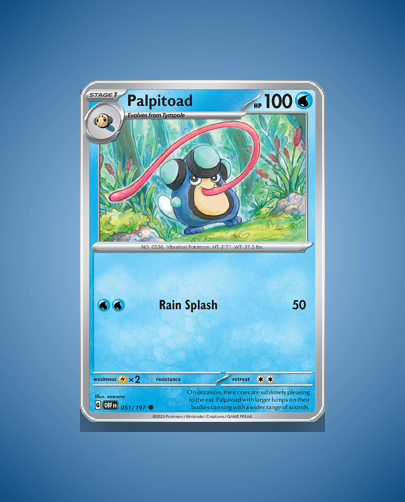 Palpitoad is a Common Water-type Pokémon from the Obsidian Flames set, card number 51. With 100 HP and the simple Rain Splash attack, it’s a straightforward, no-frills piece for set completion and evolutionary-line binders.