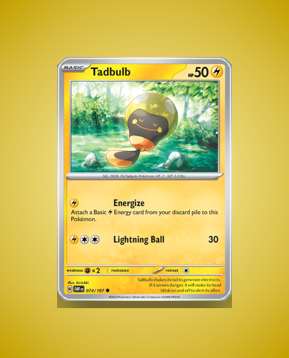 For collectors and players alike, this Tadbulb card from Obsidian Flames offers a charming glimpse into the Scarlet & Violet era’s Lightning-type Pokémon lineup.
