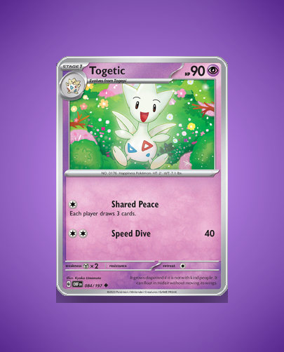 • Obsidian Flames (sv3): Togetic appears as a serene Psychic-type Stage 1 Pokémon with balanced HP and utility-focused attacks. This set emphasizes new Scarlet & Violet Pokémon with fresh artwork and mechanics, and Togetic fits the theme with its peaceful flavor text and midair floating depiction.