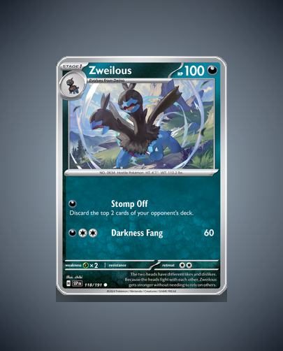• Surging Sparks (sv8): This set includes Zweilous as a Common Darkness-type Stage 1 Pokémon with disruptive and offensive moves. It fits into the Scarlet & Violet series and carries the regulation mark H, but lacks detailed flavor text or illustrator information.