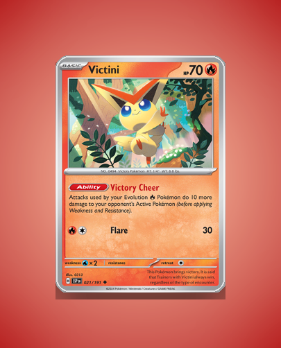 Victini from the Surging Sparks set is an Uncommon card numbered 21 with 70 HP. It features the ability Victory Cheer and the attack Flare. This card offers a balanced mix of strategic potential and straightforward play.
