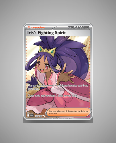 - Journey Together (sv9): This set introduced Iris’s Fighting Spirit as a Supporter card with a unique hand-refreshing ability. It stands out as a key Ultra Rare collectible within the Scarlet & Violet series.