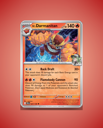 - Flamebody Cannon — requires discarding all Energy attached to N’s Darmanitan and deals 90 damage to a benched opponent’s Pokémon.