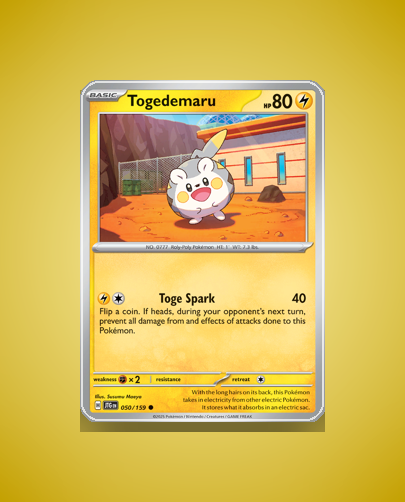 - Journey Together (sv9): Togedemaru appears as a Basic Lightning-type Pokémon with a unique defensive attack and modest HP. It fits well into collections focusing on the Scarlet & Violet series and provides a simple yet thematic electric-type option.