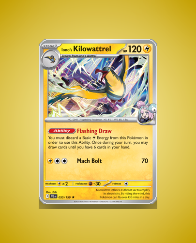 This guide focuses on the rare printing of Iono’s Kilowattrel from the Journey Together set (sv9-55). The card features artwork by chibi and includes the unique Flashing Draw ability, making it a notable addition for collectors interested in Lightning-type Pokémon and the Scarlet & Violet series.