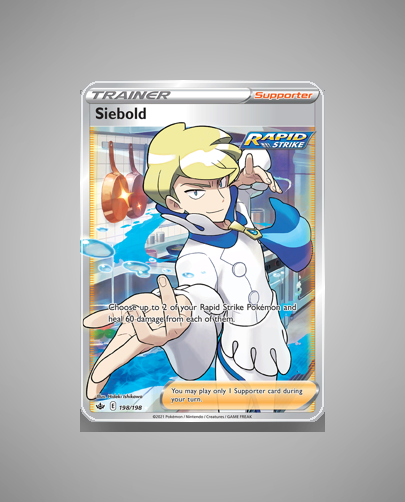 • Chilling Reign (swsh6): Introduced Siebold as a Supporter card with healing capabilities for Rapid Strike Pokémon, adding strategic depth to Rapid Strike decks. No additional printings or variants have been documented.