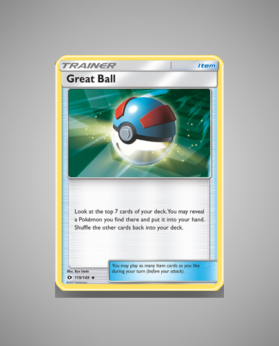 • Play Notes: Its function is to assist in deck searching by revealing a Pokémon from the top seven cards of your deck and adding it to your hand. Players may play multiple Item cards per turn, making Great Ball a flexible tool in gameplay.