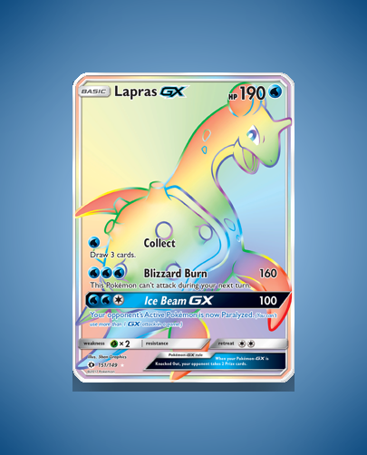 Lapras-GX from the Sun Moon set is a Rare Rainbow with 190 HP. Its standout attack, Blizzard Burn, and vibrant full-art treatment make it a notable pick for collectors seeking a powerful Water-type GX.