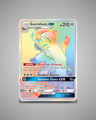 Gumshoos-GX from the Sun Moon set is a Rare Rainbow card with 210 HP. Its Ability, Search the Premises, provides valuable hand information, while Headbutt Bounce offers reliable damage. This card is numbered 157 in the series.