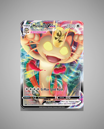 Meowth VMAX from the SWSH Black Star Promos set is a standout promo identified as SWSH005. With 300 HP and the signature G-Max Gold Rush attack, it combines striking visuals with formidable stats, making it a memorable addition to any collection.