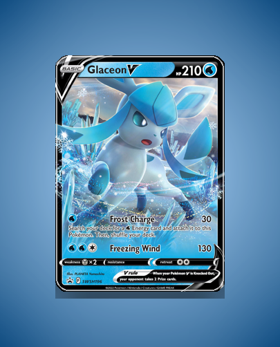- Glaceon V has two attacks: “Frost Charge,” which lets you search your deck for a Water Energy card and attach it to Glaceon V while dealing 30 damage, and “Freezing Wind,” which deals 130 damage.