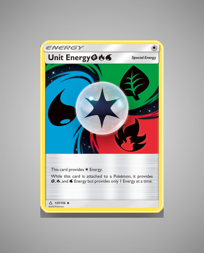 • Ultra Prism (sm5): Introduced as an uncommon special Energy card, Unit Energy GrassFireWater offers flexible energy options for decks requiring Grass, Fire, or Water Energy. Its unique ability to provide multiple types of Energy one at a time makes it a practical addition to various strategies.