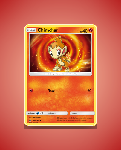 • Ultra Prism: This set includes the Chimchar card as a common Basic Fire-type Pokémon with a straightforward attack and charming flavor text. It fits well within the Sun & Moon series’ theme of diverse and colorful Pokémon.