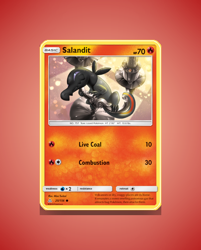 Salandit is a Common Pokémon card from the Ultra Prism set, numbered 25. With 70 HP and straightforward attacks, including Combustion, it’s an easy, no-frills addition to any collection.