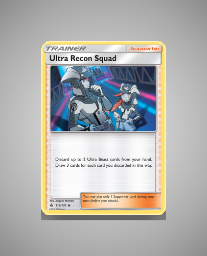 - Forbidden Light (sm6): Introduced Ultra Recon Squad as a Supporter card with a unique draw mechanic tied to Ultra Beast cards. This set focuses on strategic play involving Ultra Beasts and their support cards.