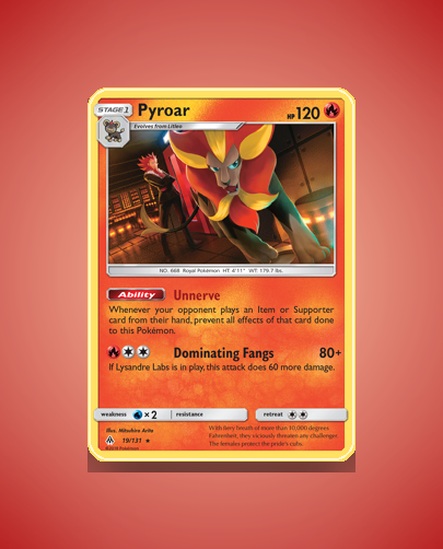 - Flavor Text: Highlights Pyroar’s intense fiery breath and protective instincts.