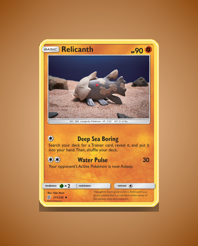 - Unified Minds (sm11): Relicanth appears as a Basic Fighting-type Pokémon with a unique combination of deck search and status-inducing attacks. This set features a variety of Pokémon with strategic versatility, and Relicanth fits as a supportive role with its Trainer-searching Deep Sea Boring attack.