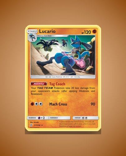 • Unified Minds (sm11): Features Lucario as a powerful Fighting-type Stage 1 Pokémon with a unique ability supporting TAG TEAM Pokémon. It fits collections emphasizing synergy and strategic damage reduction, reflecting the set’s focus on TAG TEAM mechanics through Lucario’s Tag Coach ability.