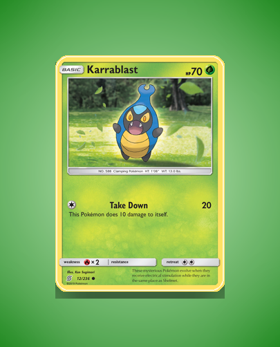 • Unified Minds (sm11): Introduced Karrablast as a basic Grass-type Pokémon with a unique flavor text hinting at its evolution method. This set features artwork by Ken Sugimori and includes Karrablast as card number 12, common rarity.