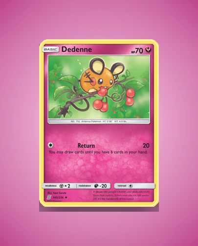 • Unified Minds (sm11): This set includes a variety of Pokémon from the Sun & Moon era, featuring dynamic artwork and diverse gameplay options. Dedenne 145 stands out as a playful Fairy-type with a useful card-drawing attack, adding strategic value and charm to the set.