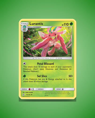 • Unified Minds (sm11): Features Lurantis as a versatile Grass-type with unique attacks that can impact multiple opponent Pokémon. This set is known for its diverse Pokémon and strategic gameplay elements, with Lurantis contributing a blend of offense and tactical damage distribution.