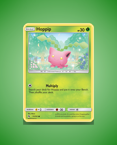 Hoppip is a Common Pokémon card from the Lost Thunder set, numbered 11. It has a modest 30 HP and features the attack Multiply. This card offers a simple yet charming addition to any collection.