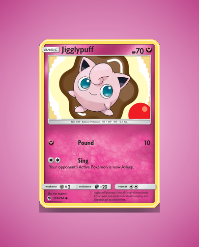 - Lost Thunder (sm8): This set includes this Jigglypuff as a Basic Fairy-type Pokémon with simple but effective attacks. The set focuses on a variety of Pokémon types and features artwork by notable illustrators like Ken Sugimori.