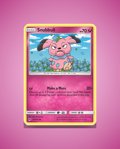 - Lost Thunder (sm8): Introduced Snubbull as a Basic Fairy-type with a unique discard-based attack. This set is known for its diverse Pokémon and strategic Trainer cards, with Snubbull fitting into the theme of tactical resource management through its “Make a Mess” attack.