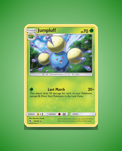 • Lost Thunder (sm8): Features Jumpluff as a Stage 2 Grass-type Pokémon with the Lost March attack that scales damage based on Pokémon in the Lost Zone. It stands out for a retreat cost of zero and resistance to Fighting-type attacks.