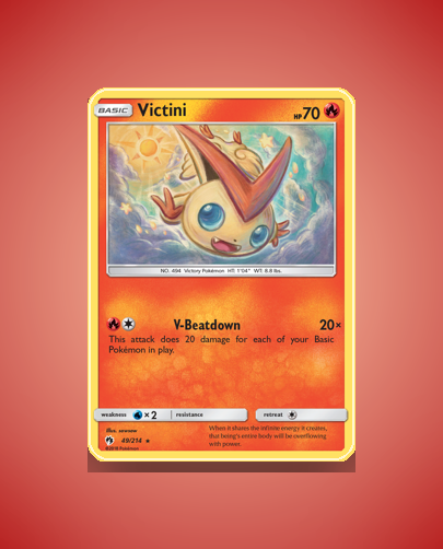 Victini from the Lost Thunder set is a rare card numbered 49 with 70 HP. It features the distinctive attack V-Beatdown, adding a dynamic element to gameplay. This card’s vibrant design captures Victini’s energetic spirit.