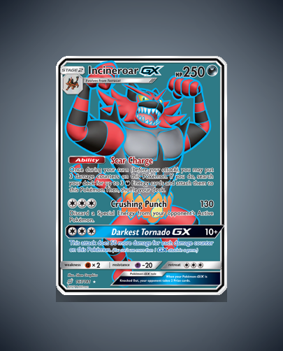 - Ability: Scar Charge — Allows placing damage counters on Incineroar-GX to attach Darkness Energy from the deck.