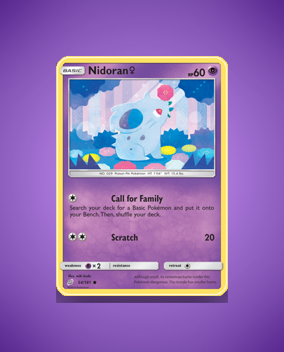 - Team Up (sm9): This set includes Nidoran ♀ as a Basic Psychic-type Pokémon with simple but effective attacks. It emphasizes bench development with “Call for Family” and basic damage output with “Scratch.” The card fits well into beginner decks and collectors focusing on early Sun & Moon series prints.