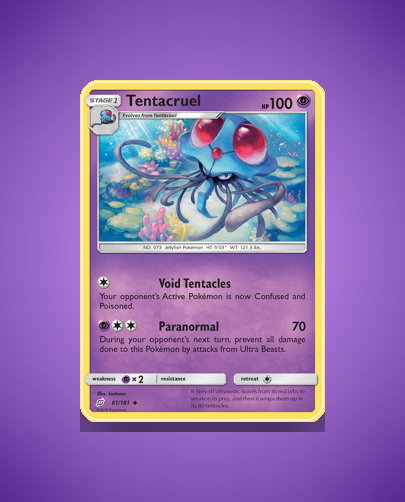 • Team Up (sm9): This set includes Tentacruel as a Psychic-type Stage 1 Pokémon with unique status-inflicting attacks and moderate HP. It fits well into decks focusing on status effects and Ultra Beast matchups. Release date is unknown.