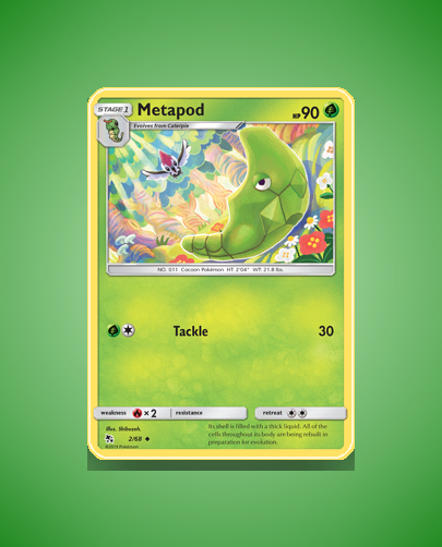 • Hidden Fates (sm115): This set includes Metapod as a Stage 1 Grass-type with a simple but effective attack. The card’s flavor text and art highlight its evolutionary biology, making it a thematic addition to any Hidden Fates collection.